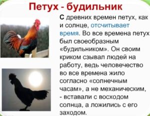 Интересные факты: А вы знали, что петух -это громкий будильник (своим “ку-ка-ре-ку” он говорит -“Это моя территория”, и предупреждает об опасности; – у него красивый наряд (ярче чем у обычных курей); – он главный на дворе (следит за порядком, показывает где найти вкусную еду); у него ранний подъём; -петух плохо летает (крылья ему нужны, чтобы бегать быстрее и драться с другими петухами); -у него хорошая память (запоминает до 100 лиц); – петушок любит купаться в пыли; -петух герой сказок; -он является символом года и долгожителем (петухи проживают от 5 до 8 лет)!
